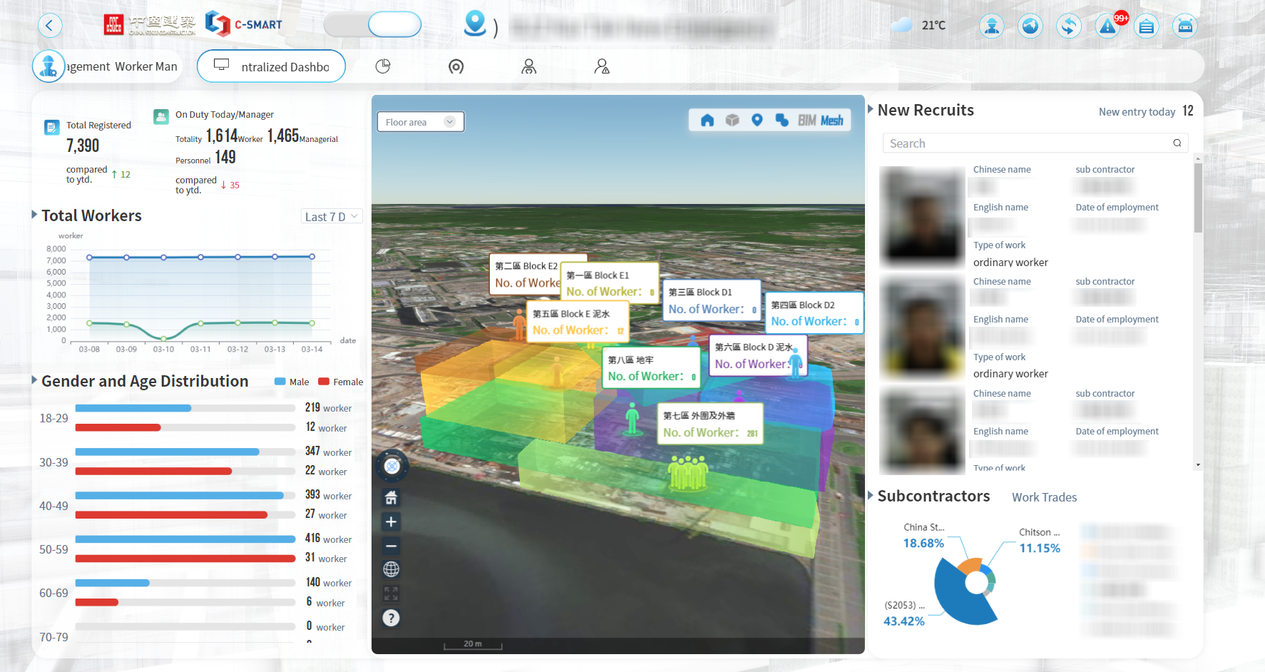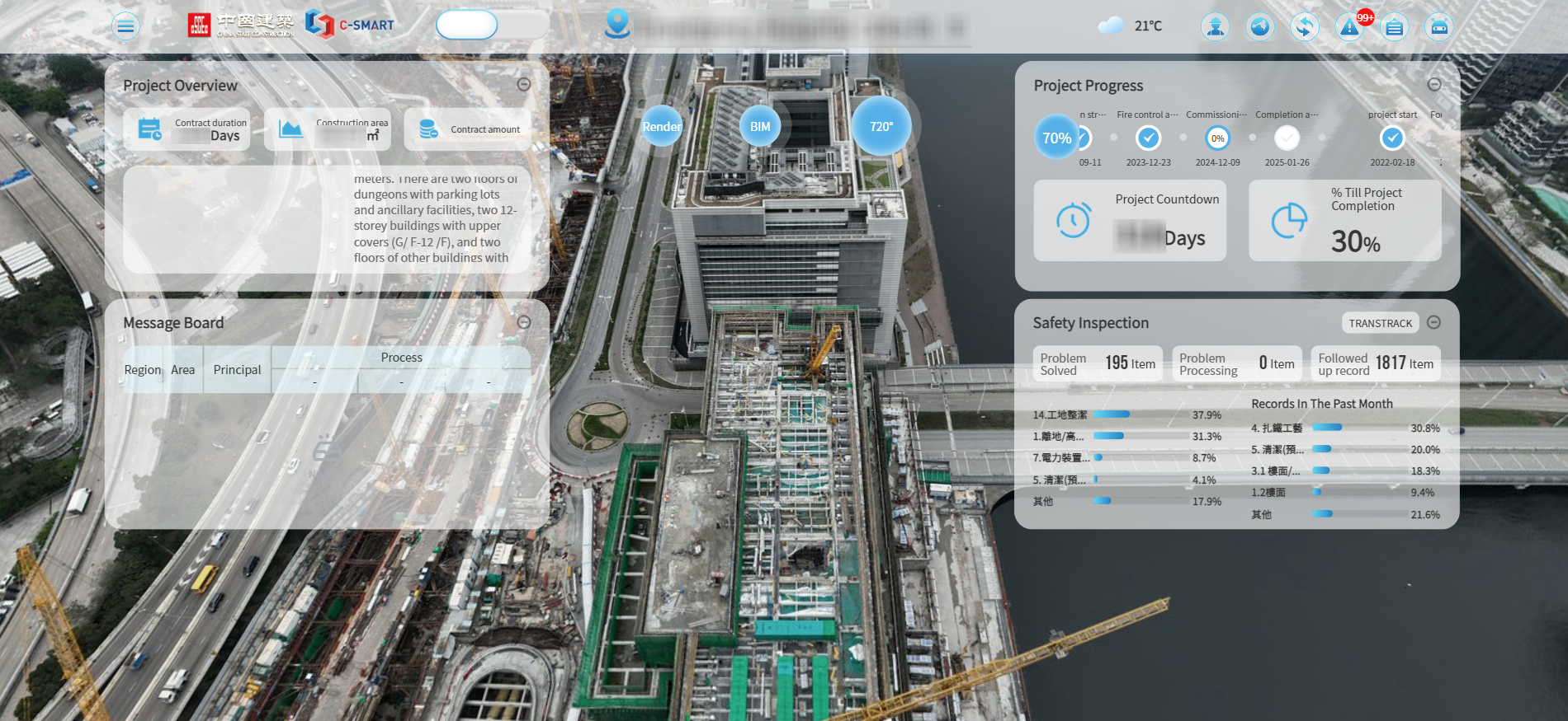 公司自主開發的C-SMART通過數字化、精細化、智慧化方式進行工程管理,以不同的創新技術如人臉識別、物聯網、人工智能等技術為基礎,將地盤的人員、設備、安全、環保、質量、進度、物資等方面資訊,自動匯總至一體化資訊管理平台,通過平台的數據分析,輔助建築工程施工管理決策,全面實現智能化監測及綜合管理。