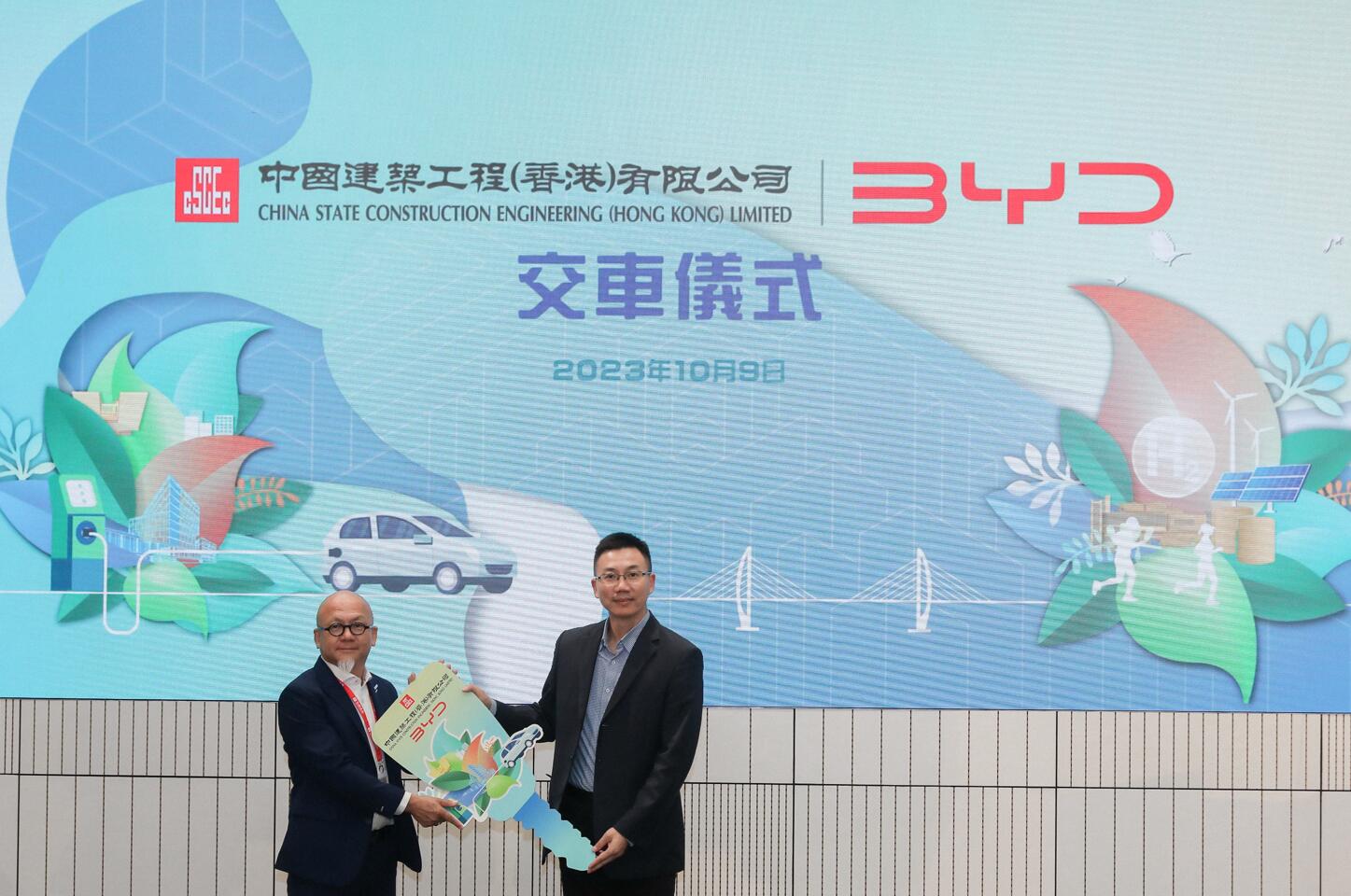 中建香港首次向比亞迪採購了超過20輛電動車於香港的建築工地使用,由中建香港常務副總經理黃江跟比亞迪運營總監張景榮完成交車儀式。