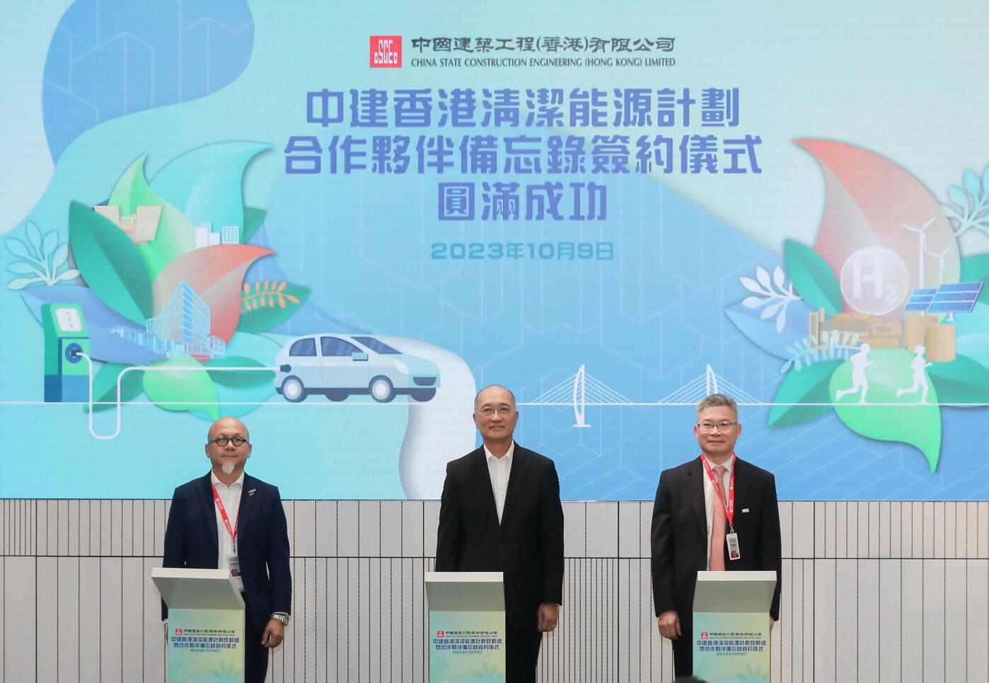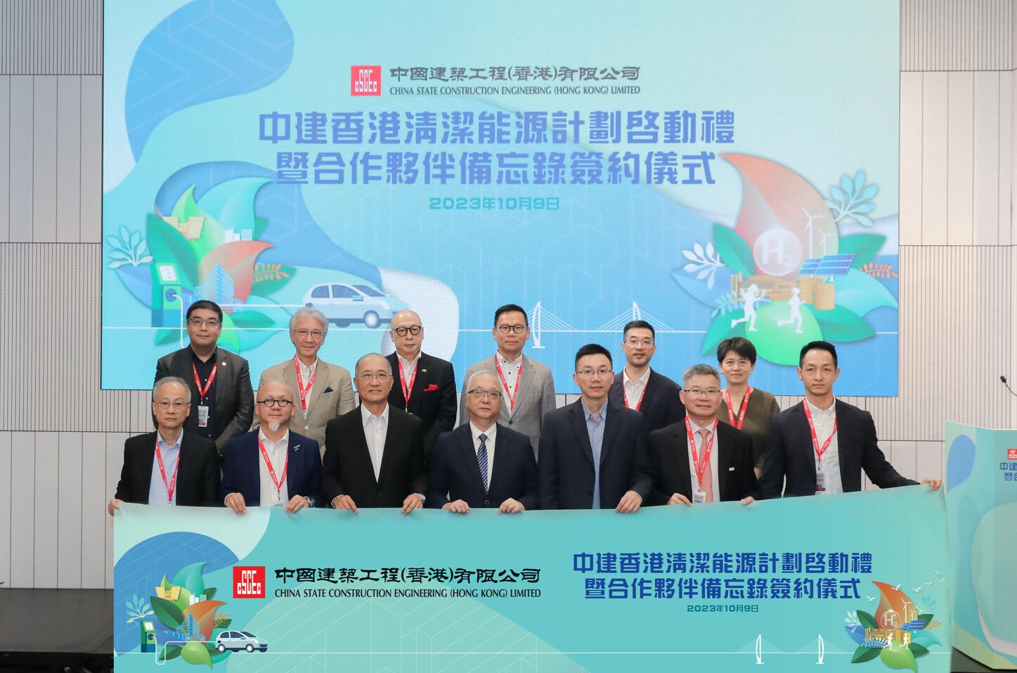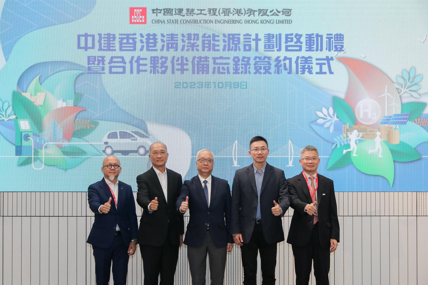 在活動上,中建香港宣佈最新的可持續發展策略,及作為重點措施的「中建香港清潔能源計劃」,其中包括三大減碳承諾:一、截至2035年中建香港地盤使用的車輛將全面電氣化,包括自用私家車及小型工程車等;二、積極探索香港建造業首個氫能應用試點並在地盤引入氫能作為能源供應之一;三、探索試行香港首個全清潔能源施工地盤,以電能、太陽能、氫能等清潔能源作為日常能源供給,是為香港建造業首個作出清潔能源應用具體承諾的企業。