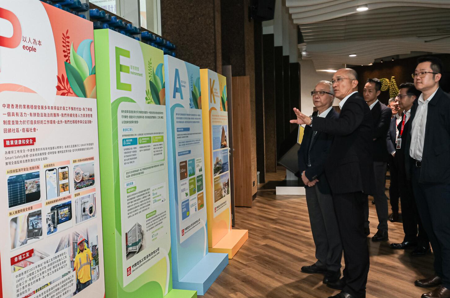 中建香港一直致力推動綠色建造和可持續發展,在是次活動上首次宣佈了可持續發展理念:P.E.A.K.。一方面,積極響應國家於2030年前碳達峰(Carbon Peak)的目標;另一方面,中建香港將一如既往秉承以人為本(People)的理念,關懷員工和工友,心繫社區,同時打造對環境(Environment)友善的低碳施工方案,並與學術界及供應鏈生態夥伴協作(Alliance),努力為香港發展建造更多重要項目(Key Projects for Hong Kong),實現香港2050年前碳中和的目標。