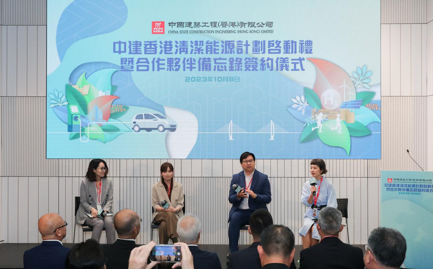 在「中建香港清潔能源計劃」啟動禮上,中建海龍科技有限公司、海宏技術有限公司及中國建築興業集團有限公司旗下遠東幕牆品牌等代表分享公司在低碳技術和智慧科技的應用實踐,攜手為建造業界可持續發展作出貢獻。