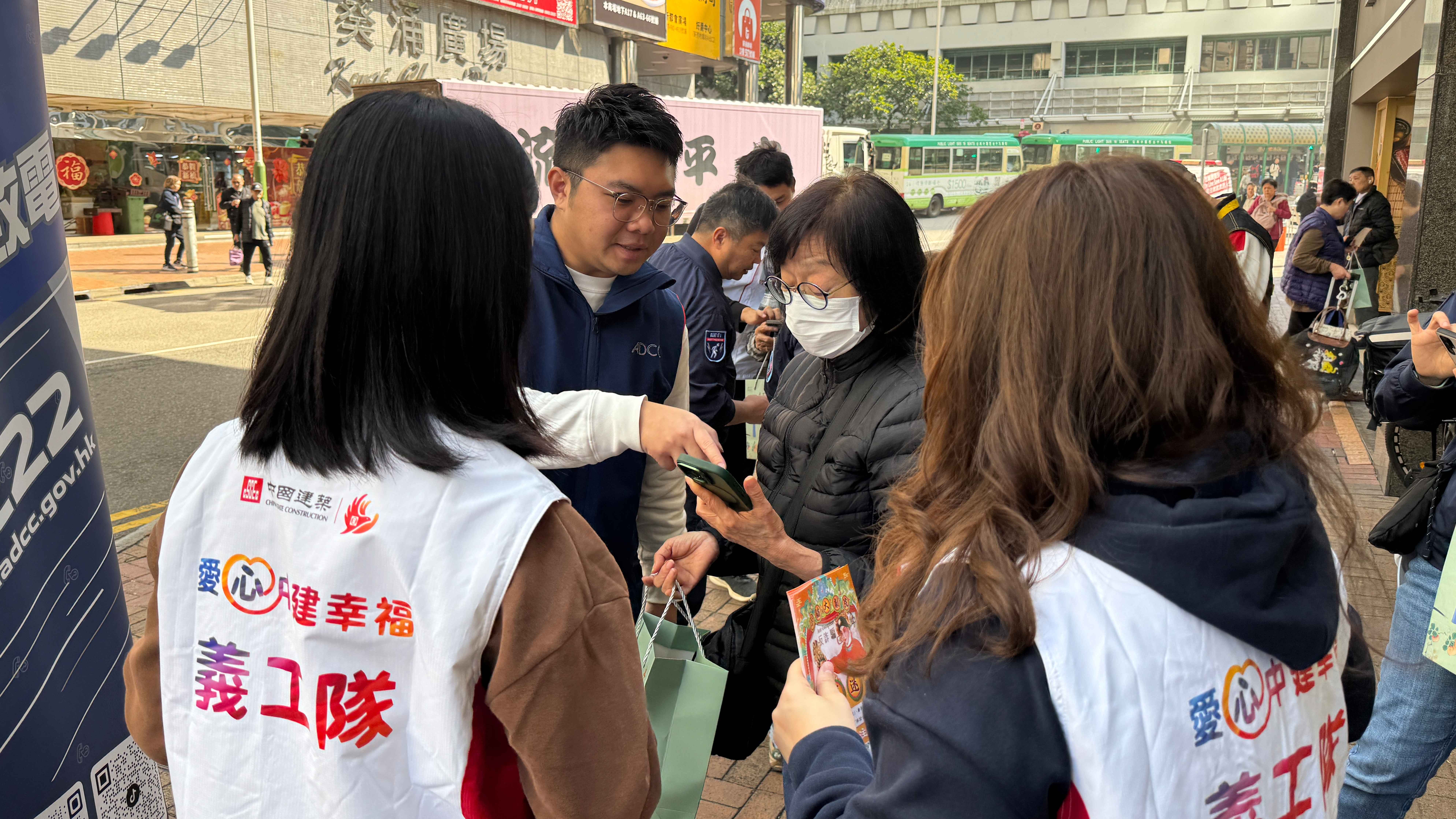 1月以來,中建香港進一步加強與ADCC的合作,全力支持「防騙宣傳車」流動宣傳活動。宣傳車一連五日陸續走訪葵芳、深水埗、灣仔、藍田及元朗等地區,通過互動講解、資料派發等形式,向途經市民詳細拆解電話詐騙、網絡詐騙等常見騙局的作案套路。其間,中建義工團隊還現場指導市民特別是長者安裝「防騙視伏器」手機應用程式,並向完成安裝的市民贈送福袋。現場互動熱烈,市民參與度高,防騙知識傳播效果顯著,累計覆蓋逾500名市民。