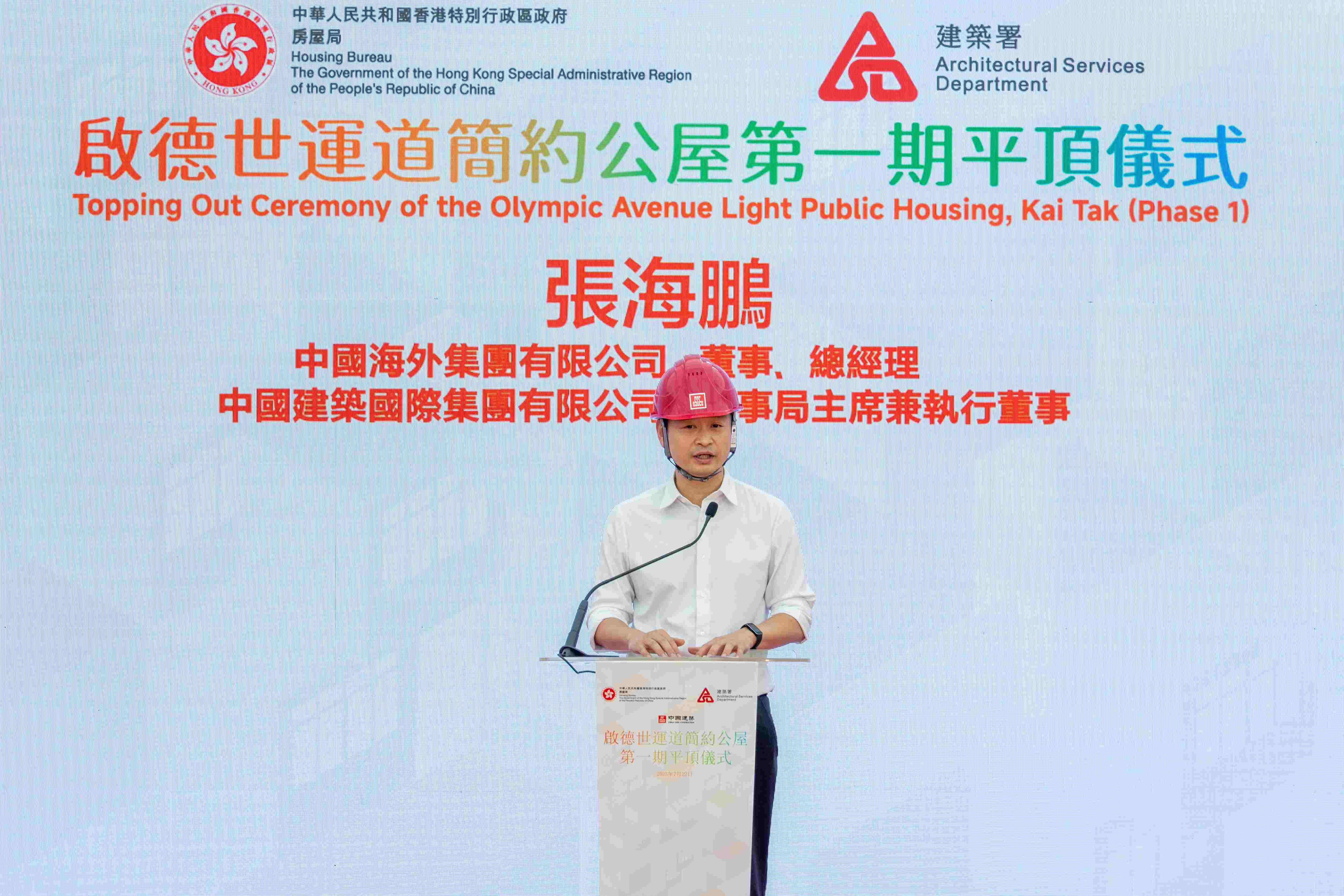 中國海外集團有限公司董事、總經理張海鵬發言指,「啟德簡約公屋項目從一開始就被賦予特殊意義,不僅要解決房屋供應的燃眉之急,更重要是探索建築工業化的香港模式。項目以建築工業化的管理方式,以『內地工廠+香港管理團隊』為核心,『工廠+現場』並行管理,同時亦通過C-SMART工程管理數字平台實現地盤智慧化管理,實現高速建設。公營房屋建設既是民生工程,更是民心工程。我們每加快一天,就有家庭離安居夢更近一步。接下來,我們將繼續在保證品質和安全的前提下,加快工程進度,確保如期交付。」