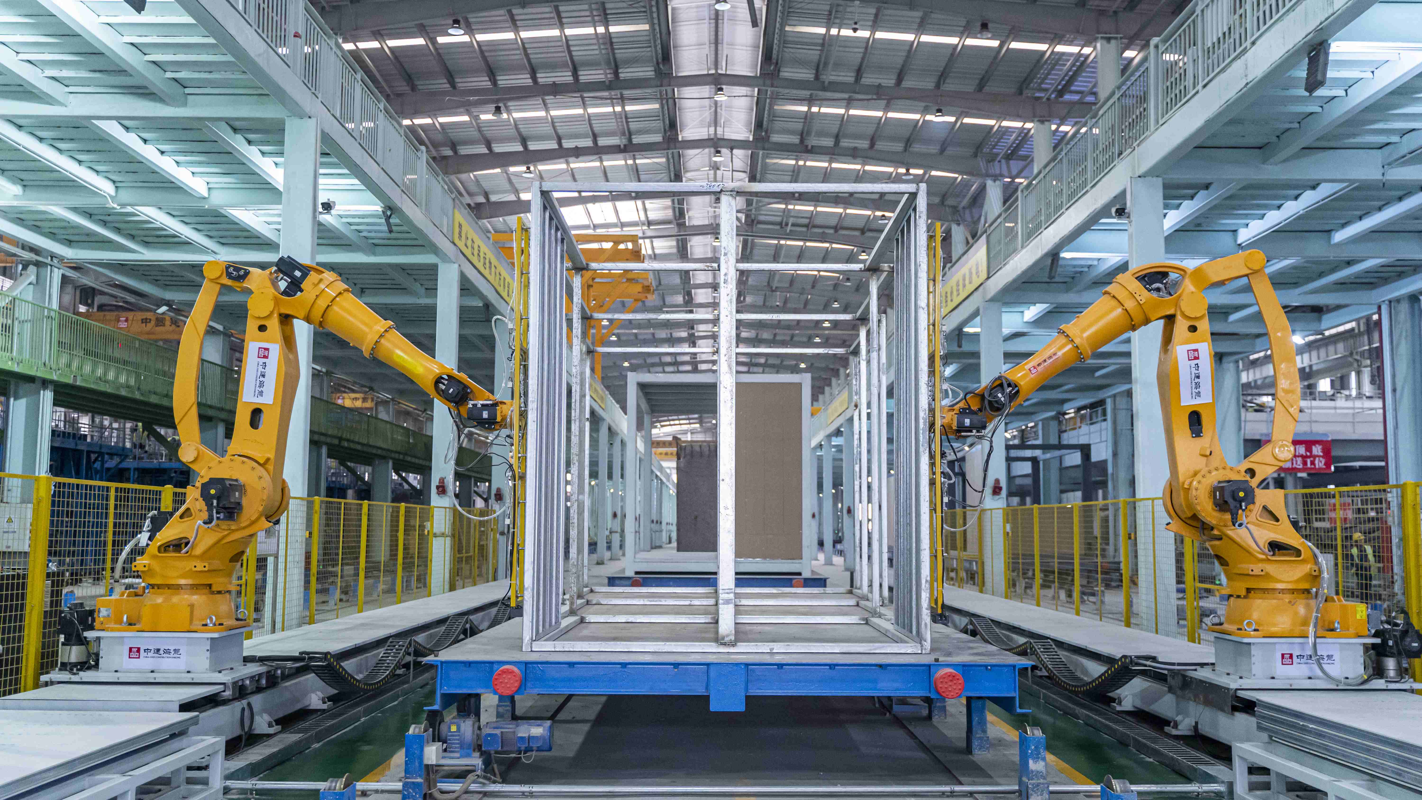 MiC工廠的工業化生產線,正在工作的裝修機械人。