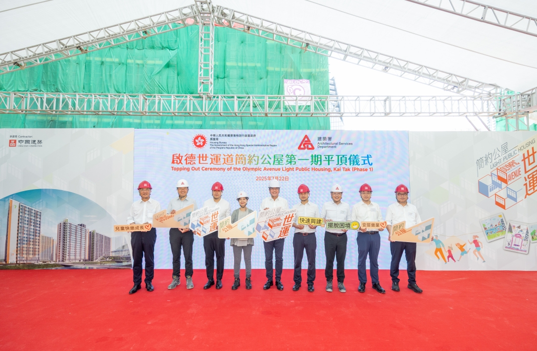 7月22日,房屋局及建築署舉行由中國建築工程(香港)有限公司(簡稱「中建香港」或公司)為其承辦設計及建造的啟德世運道簡約公屋(簡稱「世運道簡約公屋」)項目第一期平頂儀式。世運道簡約公屋,是香港特別行政區政府推出的「簡約公屋」計劃中,單位數量最多、規模最大的一個項目。中建香港充分利用大灣區MiC產業協同的優勢,將約70%工序前置在珠海及江門等廠房,以工業化生產的嚴謹標準、並配合現場吊裝MiC模塊最快「3天1層」的建造速度,項目第一期從進場到完工預計只需約22個月,讓「簡約公屋」達致「提速、提效、提質、提量」的目標。