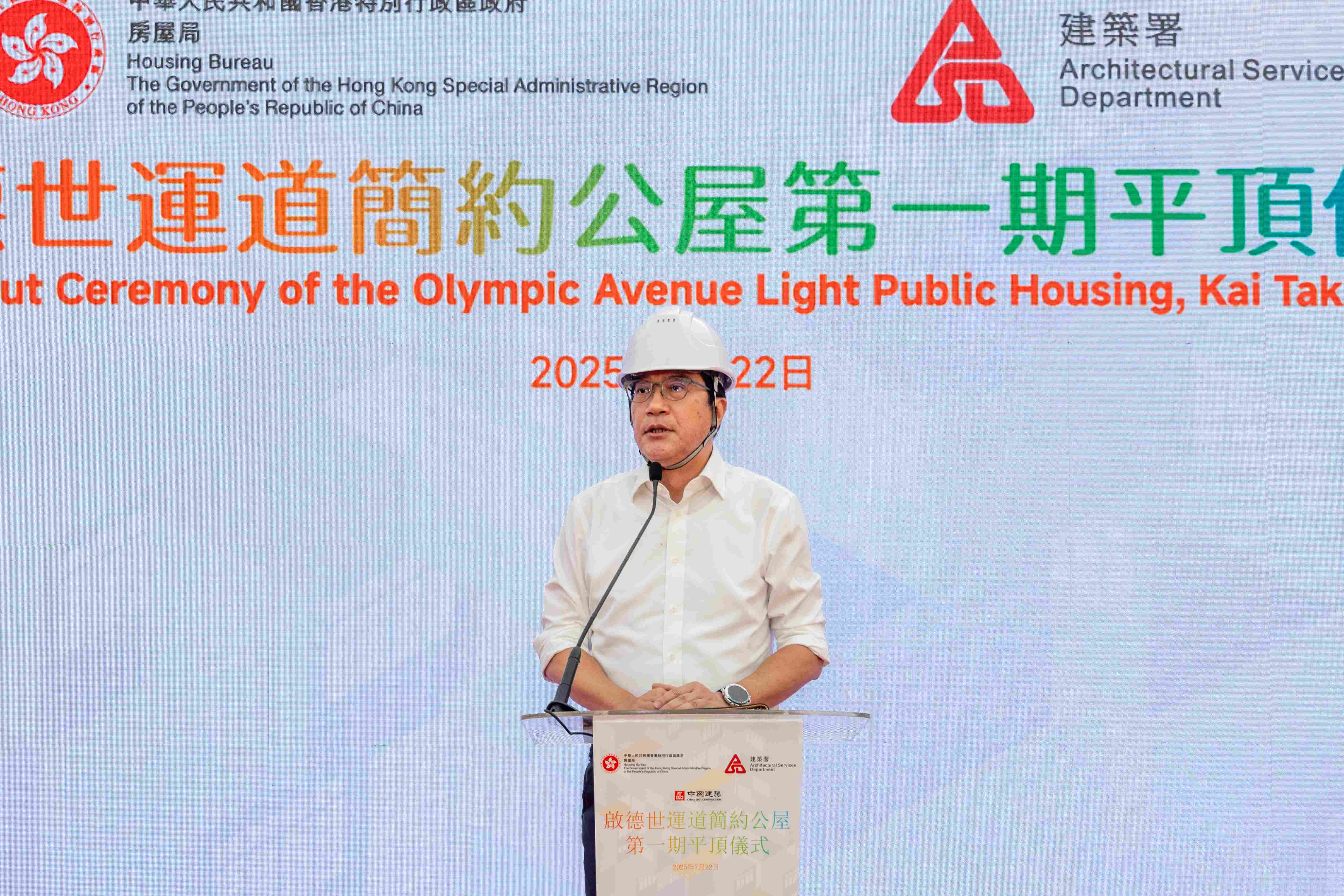 財政司副司長黃偉綸在平頂儀式上表示,「我曾經多次到居住在劣質劏房的居民家中探訪,深切體會到改善居民生活環境是一件很有意義的事。世運道簡約公屋從2023年12月開始建造,僅用19個月已經完成3座17層住宅樓宇的主體結構,這樣的進度來之不易。據我了解,項目第一期的部分地基深入地底多達60多米,是非常大的挑戰。世運道簡約公屋證明了『組裝合成』在香港是能做得到的,亦可以見到中國建築的強大實力和對香港的責任擔當。」