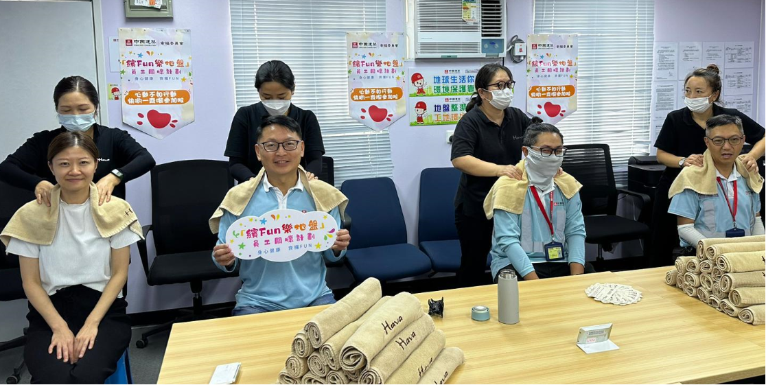 為緩解工作壓力,小蠔灣車廠物業發展項目特別安排了兩場守護員工健康活動,包括邀請專業人士為員工進行肩頸按摩舒緩疲勞及帶領員工練習搏擊操強身健體、放鬆心情。這些舒展身心的活動讓員工釋放了壓力,補充了能量。