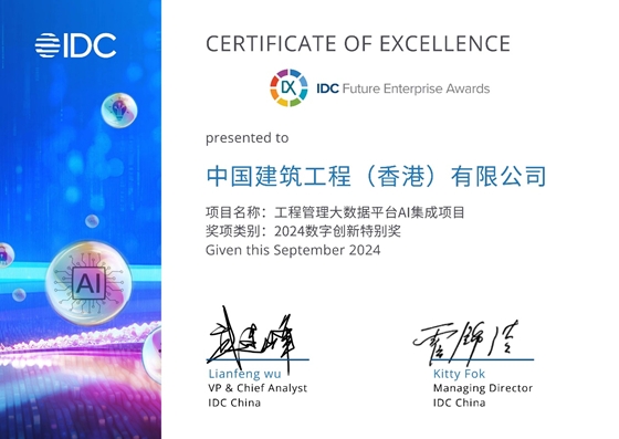 近日,IDC中國在上海舉辦2024 IDC中國年度峰會暨頒獎典禮。中國建築工程(香港)有限公司(以下簡稱「中建香港或「公司」)憑藉在工程管理領域的數字創新實踐,榮獲IDC中國區「2024數字創新特別獎」,是唯一獲獎的中國區建築企業。同時,中建香港信息化業務負責人李雁飛榮獲「年度數字化轉型CIO大獎」。