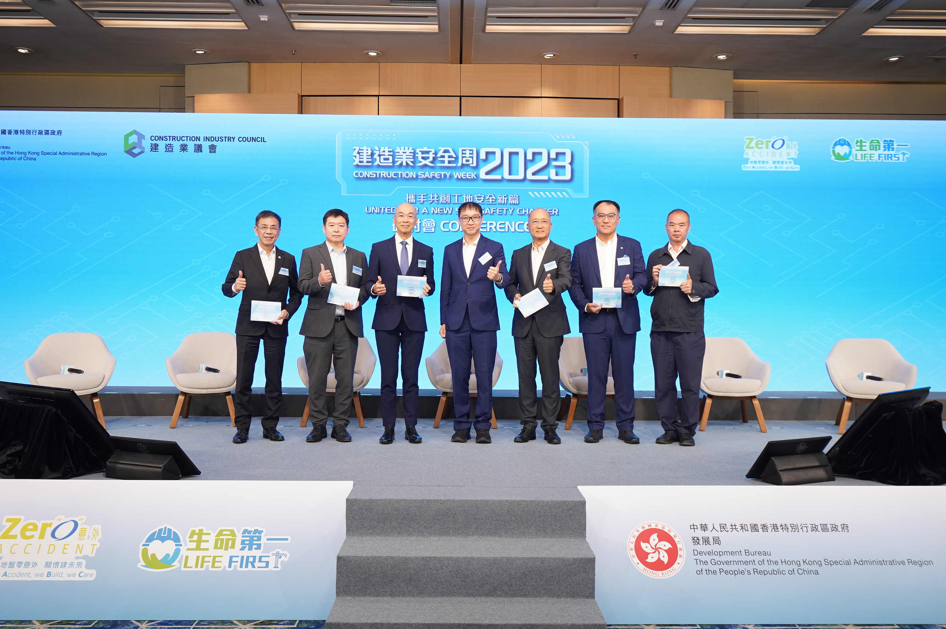 中國建築工程(香港)有限公司出席由發展局和建造業議會合辦的「建造業安全周2023」,公司董事長孔祥兆太平紳士(右三)獲邀在「開幕典禮暨研討會」擔任講者,分享智慧安全工地的建築科技,以及介紹自主研發的「C-SMART 工程管理數字平台」及「幸福工友流動應用程式」。