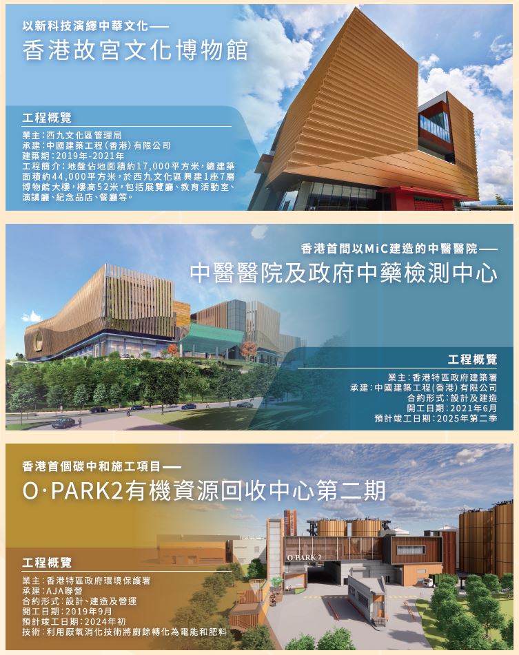 隨著社會結構變化和科技急速發展,建築業逐漸走向「智慧建築」。技術創新是發展的關鍵動力,而新技術的廣泛使用正使建造業發生徹底的變化。中建香港持續投資於智慧設施,把營運漸漸數碼化。公司廣泛應用先進建造技術,例如:建築信息模擬技術(BIM)、「組裝合成建築法」(MiC)、可持續低碳建材、工地電氣化及可再生能源等,建造了一個個標誌性綠色建築,例如:「香港首個投入營運的逆滲透技術的—將軍澳海水化淡廠」、「香港首間以MiC建造的—中醫醫院及政府中藥檢測中心」、「香港首個碳中和施工項目的—O⬝PARK2有機資源回收中心第二期」等。