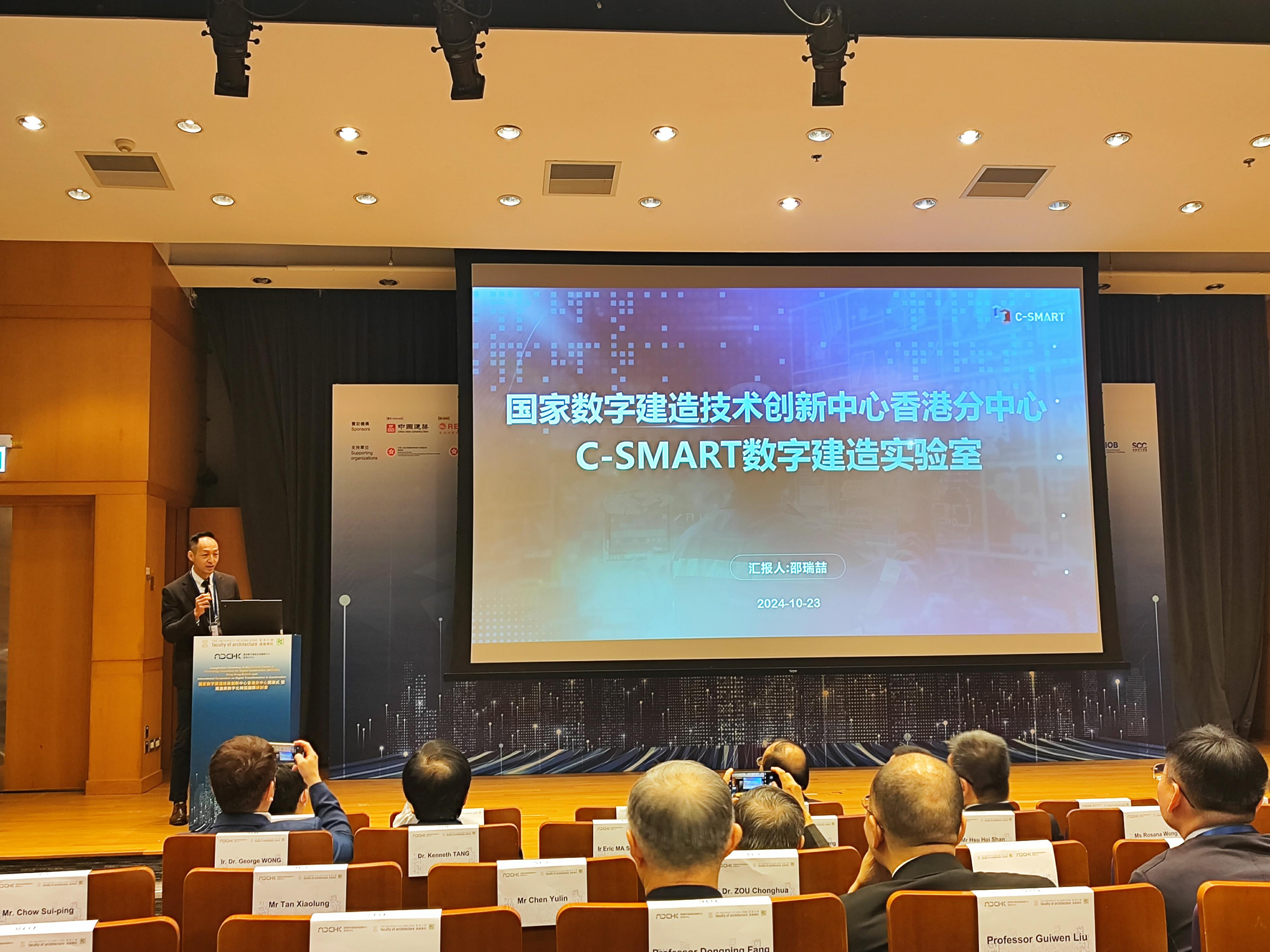 揭牌儀式上,中建香港助理總經理邵瑞喆著重介紹了中建香港 C-SMART 數字建造實驗室的發展情況,詳細闡述中建香港在建築工業化、低碳化、數字化及國際化方面的技術儲備,並在遠程質量驗收、4S+安全管理模塊、施工機器人的改良與應用、樓宇設備智慧運維、AI Scan to BIM遠程驗收等研究方向上的探索與成績。