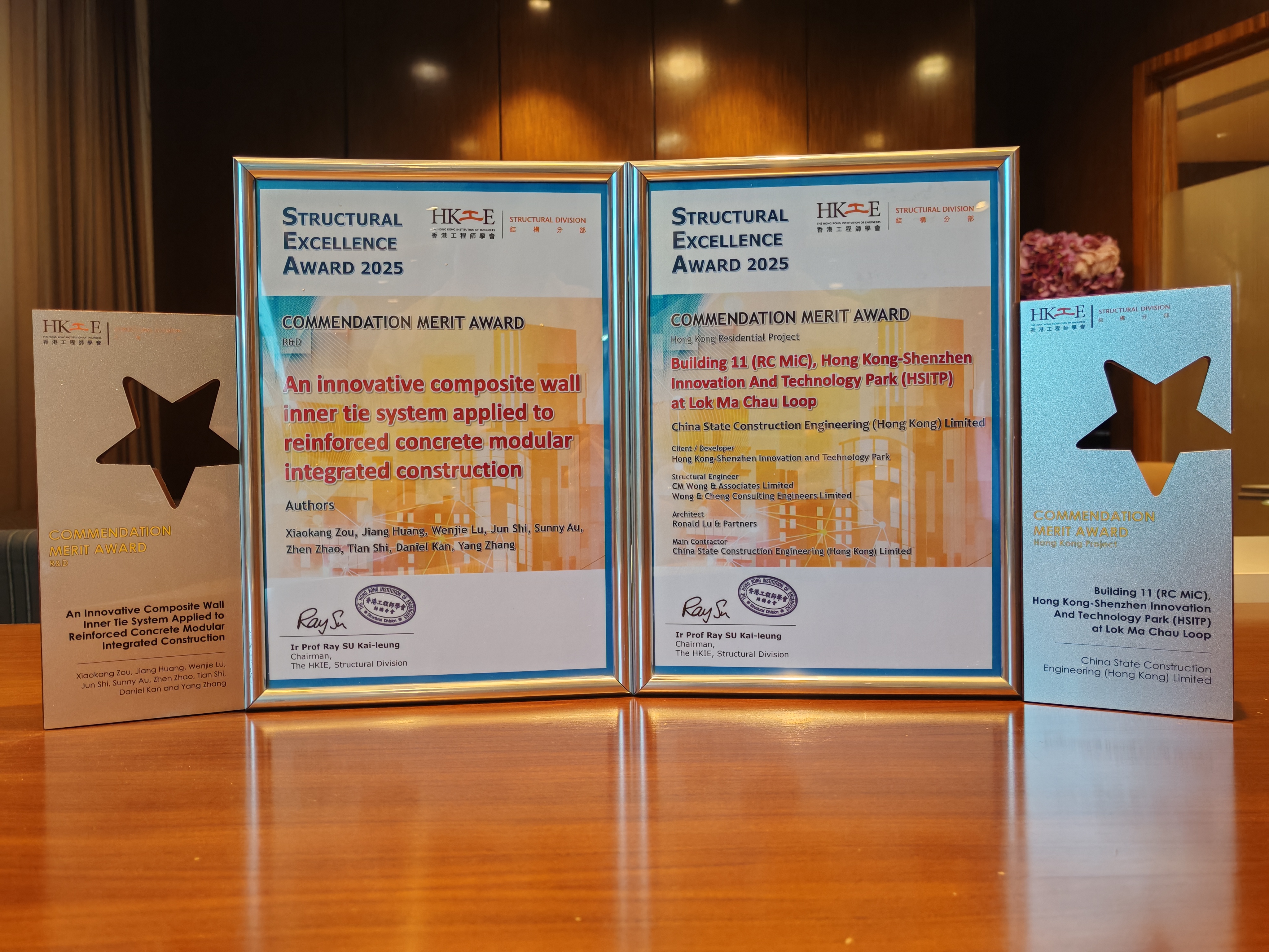 中建香港今次表現亮眼,不僅再度申報項目類獎項,更首次涉足研發類獎項申報,最終雙雙獲獎,充分體現了公司在結構工程領域從技術研發、成果轉化到項目落地的全鏈條創新實力與核心競爭力。其一,落馬洲河套區港深創新與科技園11號大樓項目榮獲「香港住宅項目」組別卓越結構嘉許獎。該大樓是全混凝土MI C項目,其中MIC部分由中建香港負責設計及建造(D&B),房屋公司結構技術研究中心(下稱“結構中心”)深度參與MiC設計與審批,自主研發新技術,成功攻克鋼筋混凝土MiC三明治牆現場澆築混凝土的行業關鍵痛點,結構中心並與項目部一起鑽研將創新MiC節點設計與施工順序有效結合,高效解決現場施工難題;將數字化技術深度融入設計、施工、管理全環節,實現工程品質與施工效率的雙提升。其二,结构中心自主創新成果《一種用於鋼筋混凝土MiC中的新型「三明治牆」內部對拉系統》,榮獲「研發及應用」組別卓越結構嘉許獎。該對拉系統專門針對落馬洲河套區11號大樓項目的核心技術痛點研發而成,最終成功應用於項目實踐。這一創新成果不僅將混凝土MiC內部裝修的工廠預製率提升至95%以上,更節省了施工成本及縮短了建築工期,實現了技術創新與經濟效益、效率效益的三重提升。