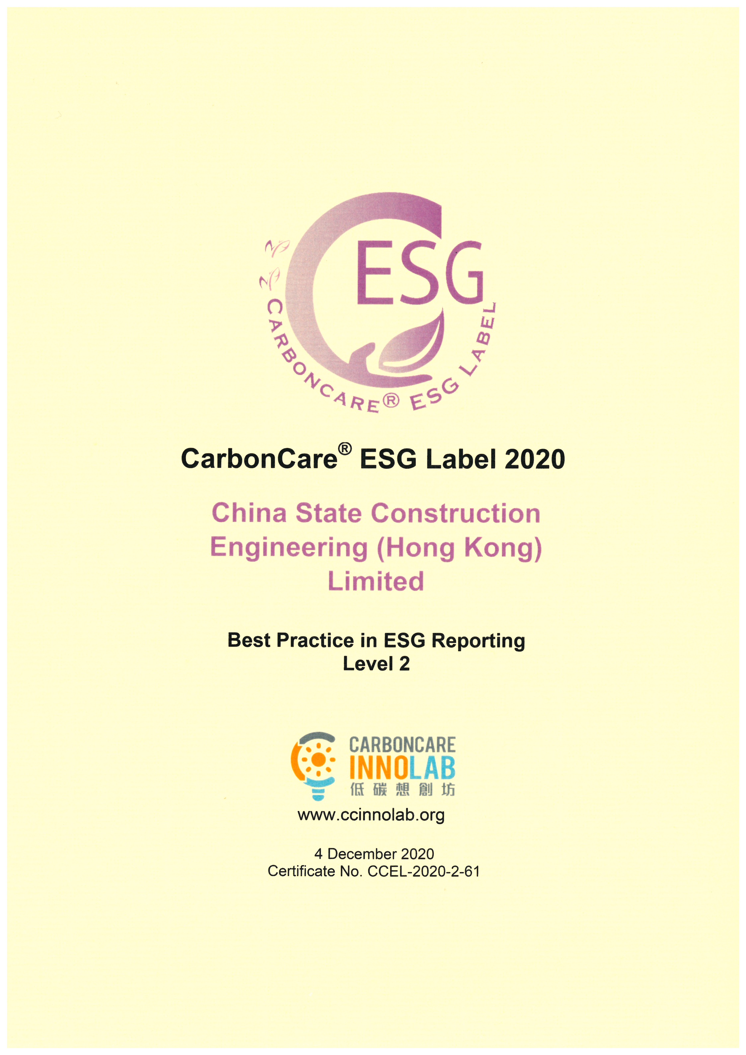 (2020年12月7日) 中國建築工程(香港)有限公司(“中建香港”,以下簡稱“公司”)欣然宣佈,公司首次獲頒發「低碳關懷環境、社會及管治(ESG)標籤」,標籤評級為LEVEL 2,表彰公司高質素的ESG工作,相關披露達到領先水平,並嘉许公司在可持續發展方面的努力。是次獲頒發獎項的公司中,公司為唯一非上市公司。中建香港總經理孔祥兆出席了相關頒獎禮,並代表公司領取獎項。