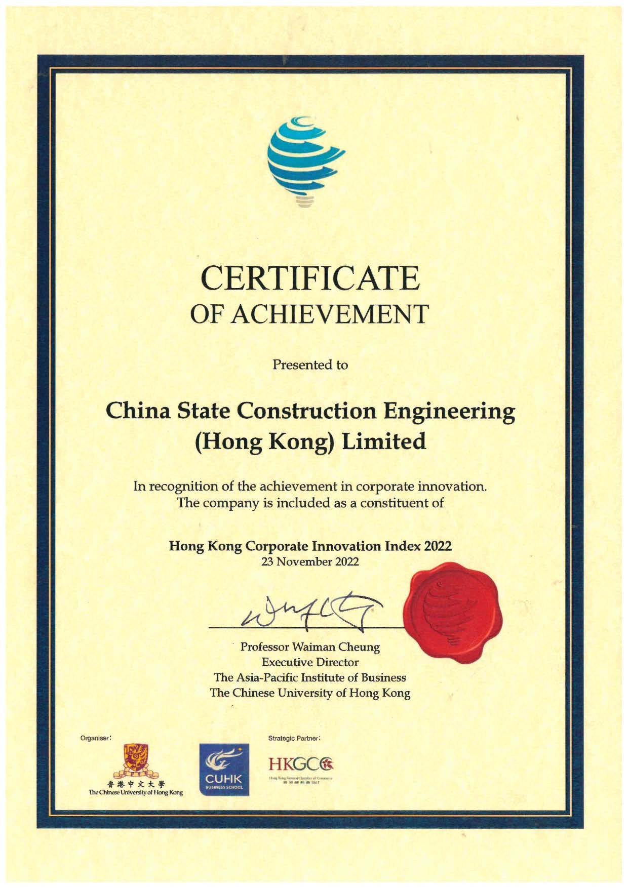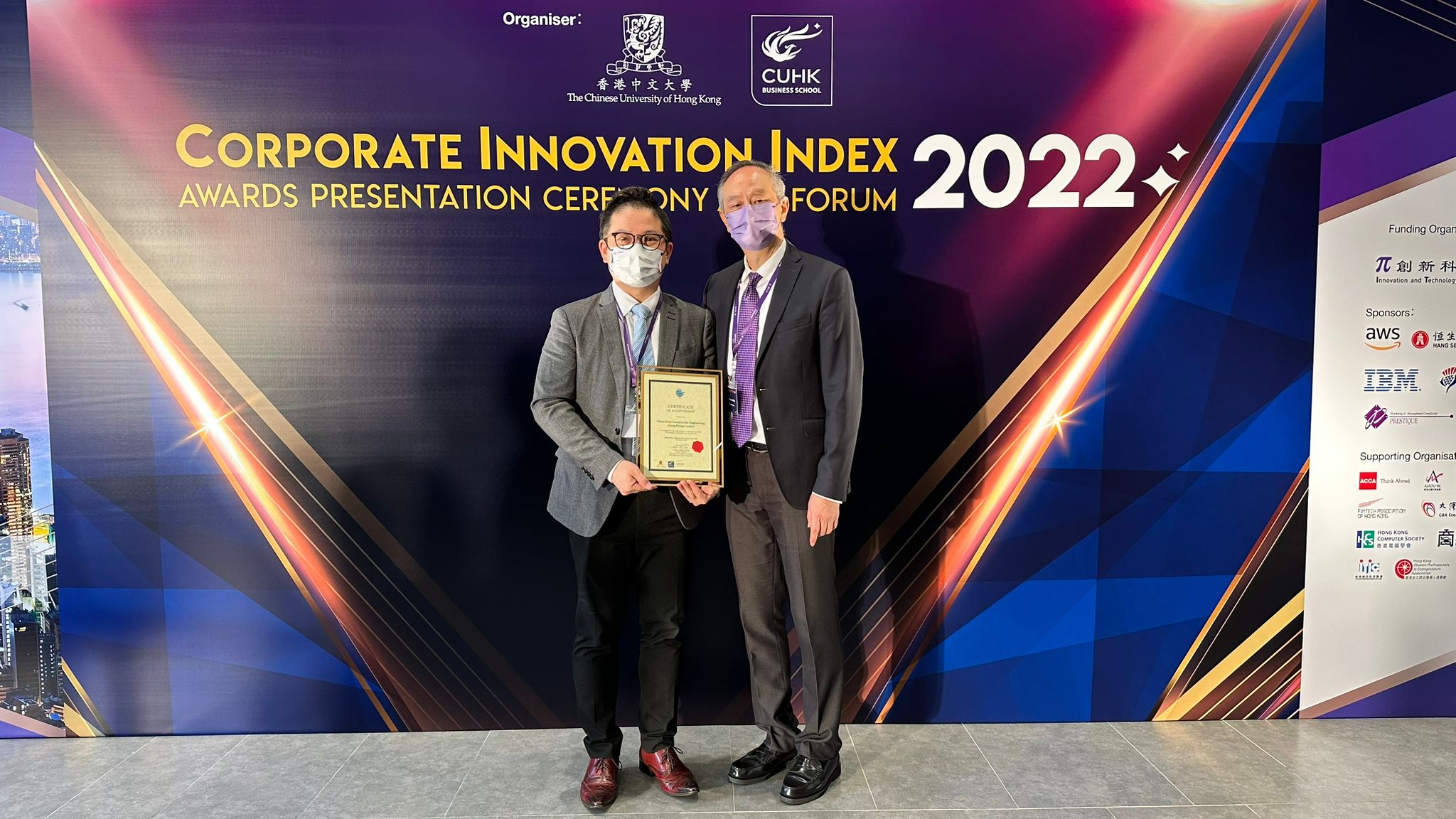中國建築工程(香港)有限公司(以下簡稱“中建香港”或“公司”)受邀參加由香港中文大學(中大)商學院亞太工商研究所(APIB)主辦的首屆 “企業創新指數頒獎典禮暨論壇2022”,並於論壇獲評“企業創新指數”20強成分公司。