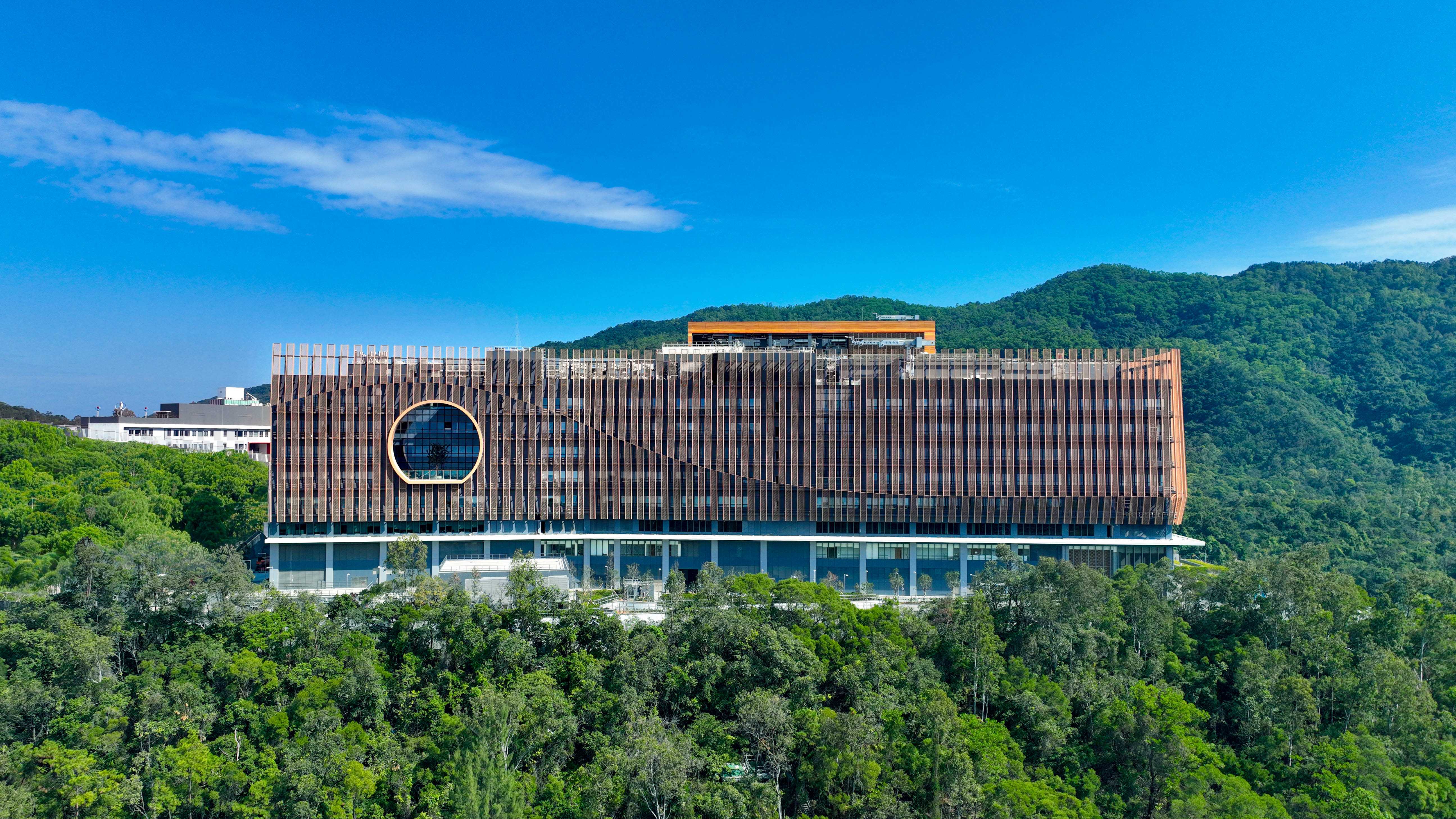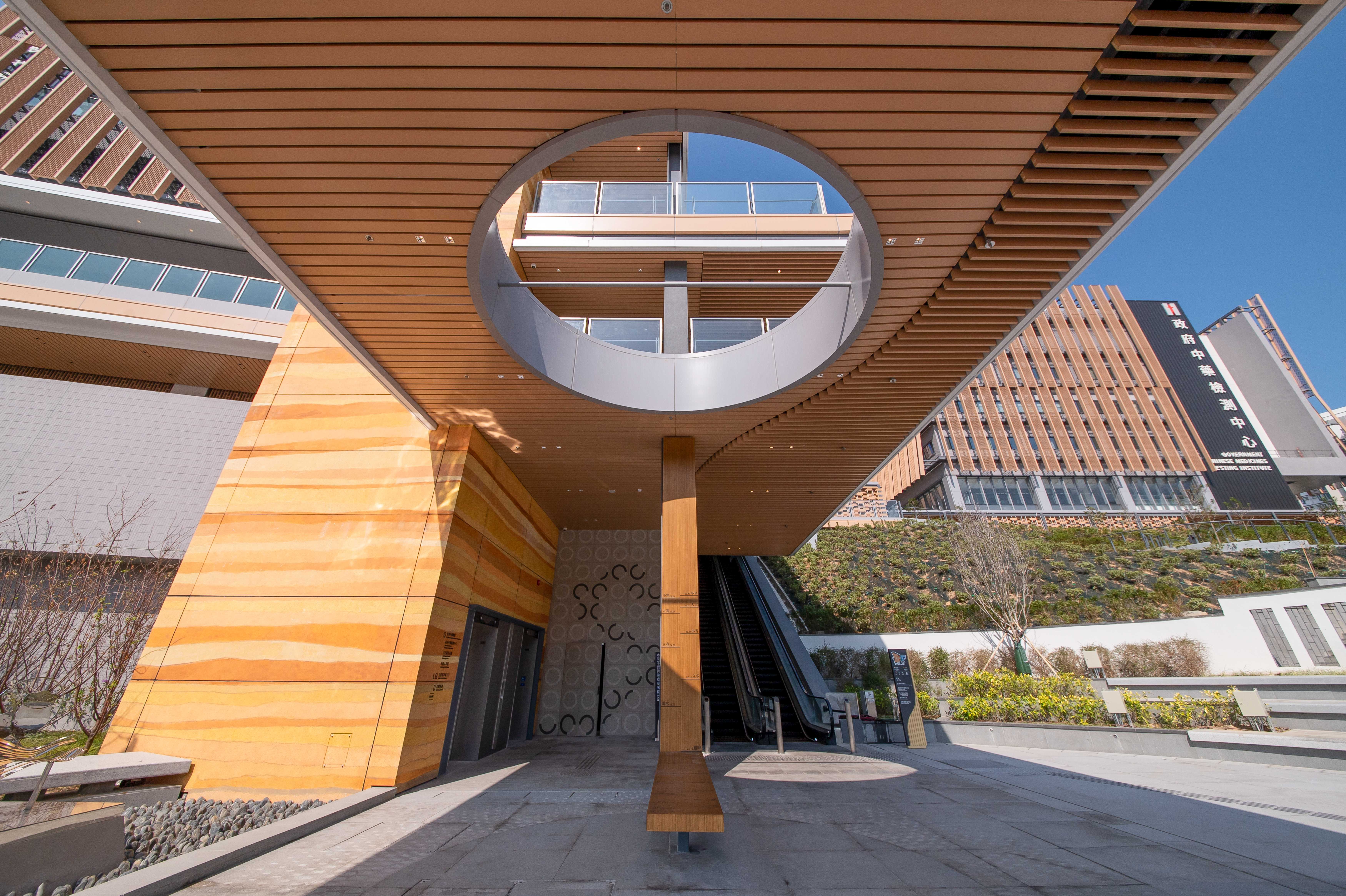 建築外牆呼應依山傍海的自然環境,結合中醫藥文化元素與現代建築設計。