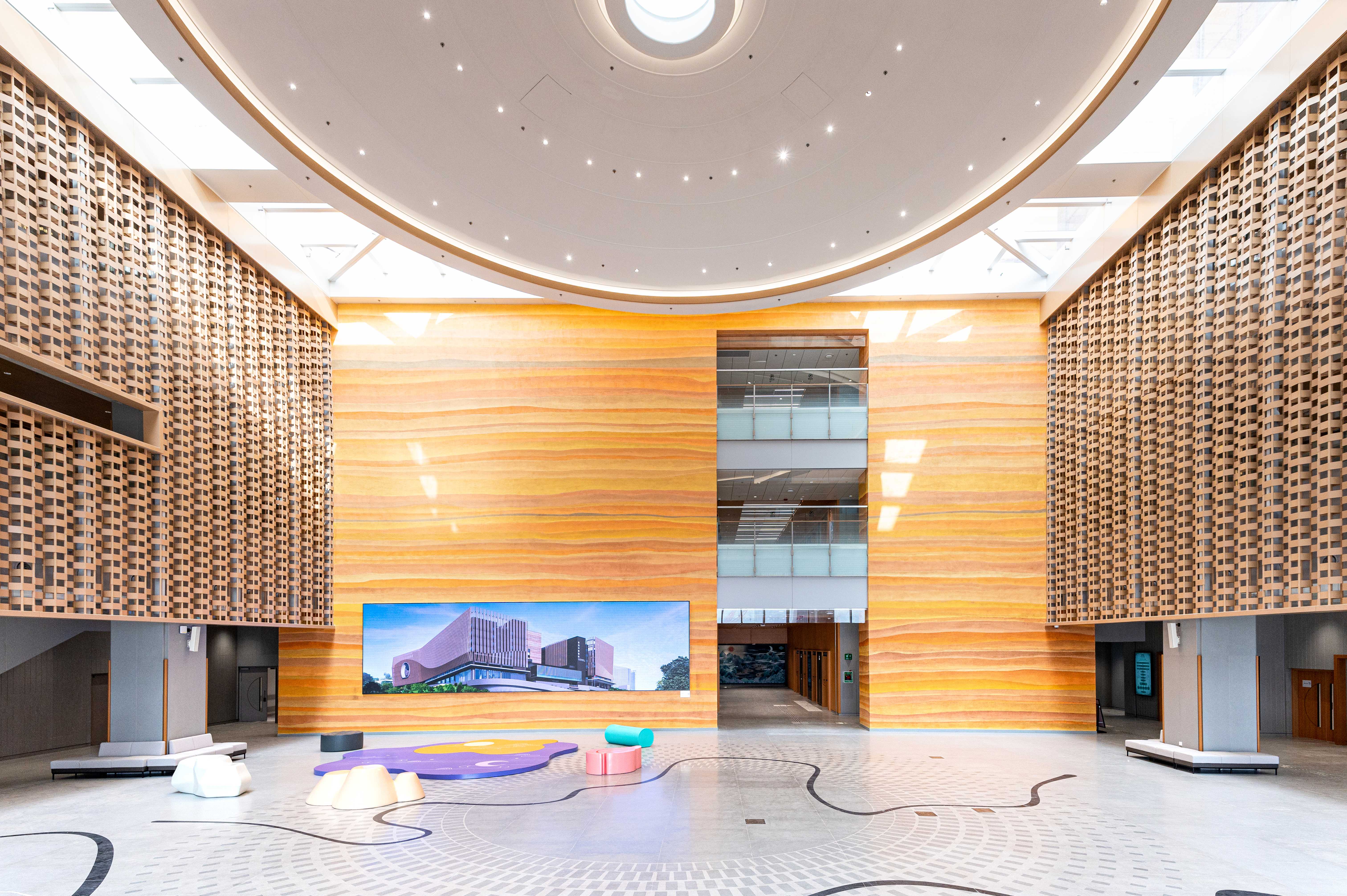 中庭構建「天圓地方」佈局,融入五行相生理念,結合自然光影,呈現中醫藥文化特色。