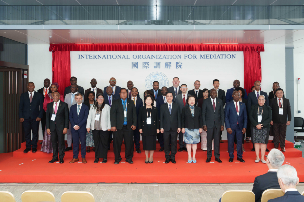 圖示(左起)律政司政務專員王學玲、建築署署長李翹彥、發展局常任秘書長(工務)劉俊傑、外交部駐港特派員公署特派員崔建春、律政司司長林定國、國際調解院籌備辦公室主任孫勁博士、律政司國際法律專員丁國榮博士和中國建築國際集團有限公司執行董事兼行政總裁王曉光於總部大樓合照。
