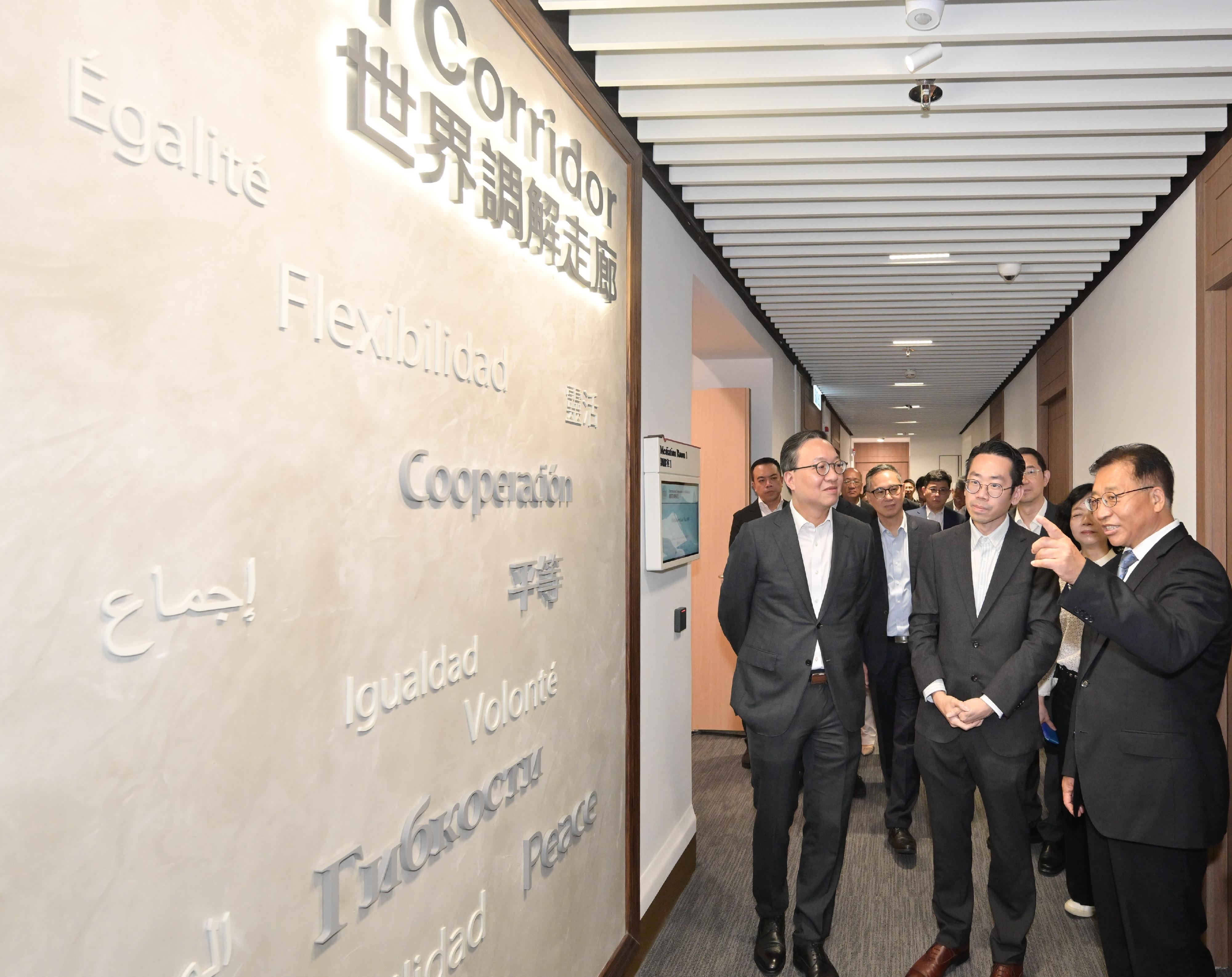 律政司司長林定國、外交部駐港特派員公署特派員崔建春、國際調解院籌備辦公室主任孫勁、發展局常任秘書長(工務)劉俊傑、律政司國際法律專員丁國榮、建築署署長李翹彥、律政司政務專員王學玲,以及中國建築國際集團執行董事兼行政總裁王曉光、高級副總裁張杰、執行董事孔祥兆等於2025年 7 月 30 日到國際調解院總部大樓參觀。
