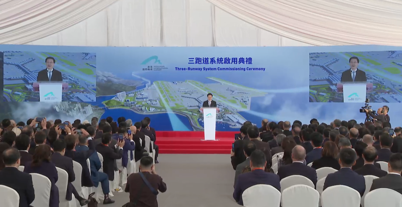 儀式上,行政長官李家超對工程期間各持份者攻堅克難、如期完工表達感謝。他強調,今日啟用的香港三跑道系統項目,建造工程於2016年展開,規模差不多等於興建一個新機場,包括興建一條全長3800米的新跑道以及重新配置一條原有跑道等多個核心工程。香港國際機場是香港,以至整個粵港澳大灣區通往世界的重要門戶。隨著三跑道系統的啟用,香港國際機場無論在貨運和客運方面都會再創高峰,將進一步帶動香港的旅遊、餐飲、零售、酒店等行業。