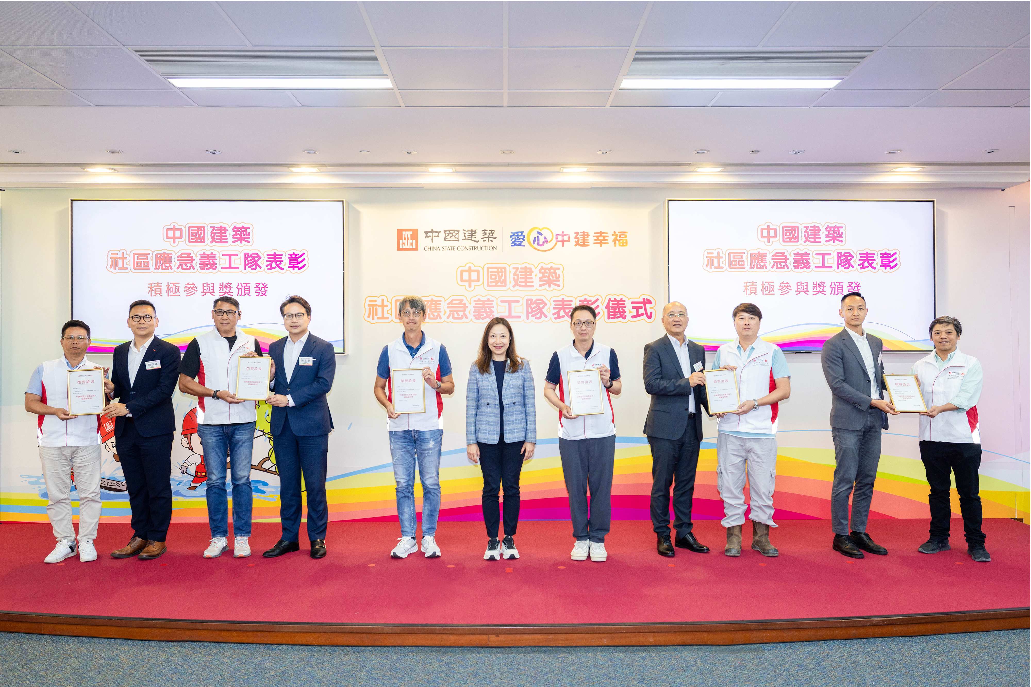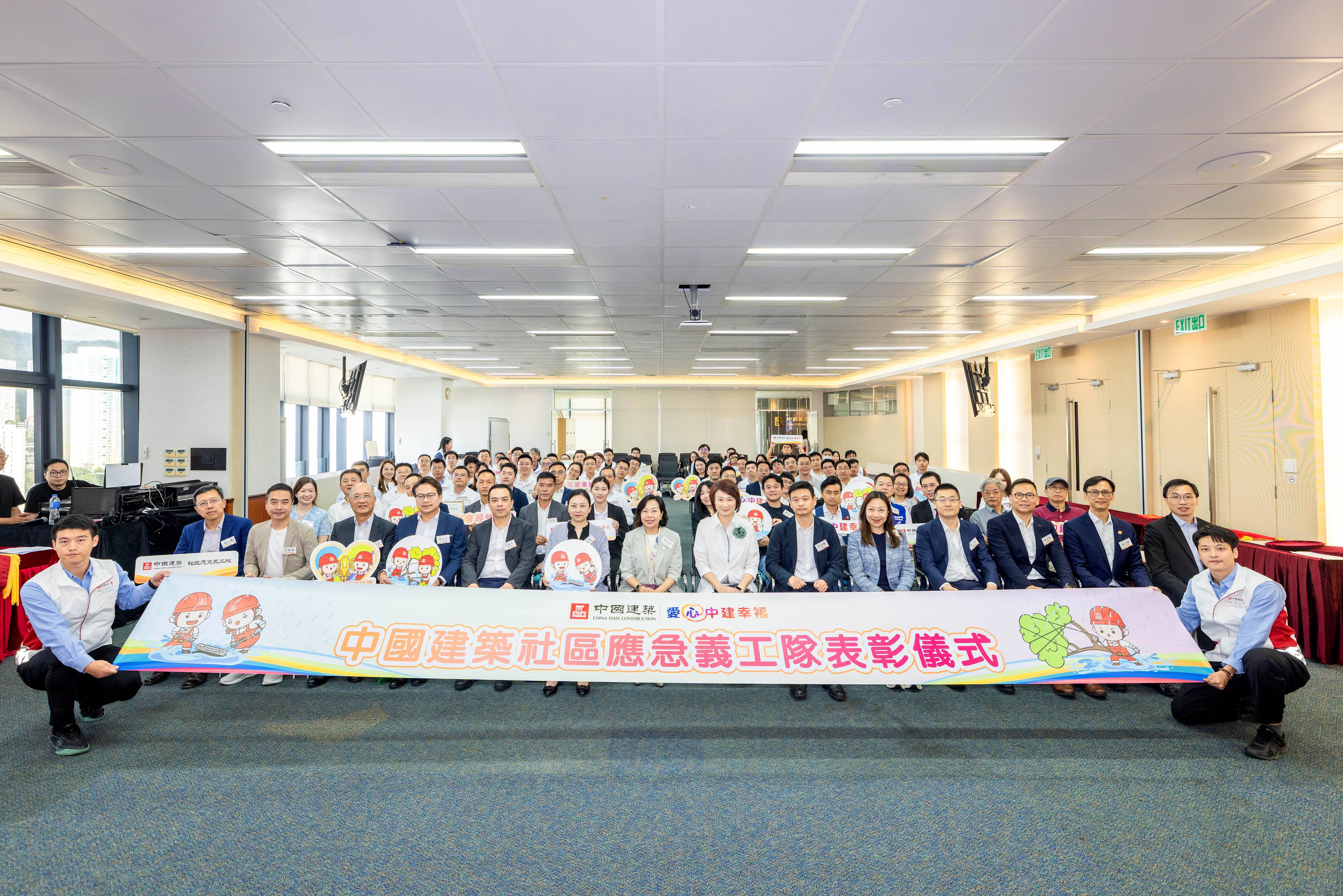集團日前在觀塘舉辦「中國建築社區應急義工隊表彰儀式」,以答謝義工同事無私貢獻時間與精力服務社會,並特別邀請香港特區政府民政及青年事務局局長麥美娟,全國人大常委會委員、立法會議員李慧琼,香港特區政府民政事務總署署長杜潔麗,香港特區政府發展局副秘書長陳志豪以及香港社會各界代表作為主禮嘉賓。中海集團董事、總經理張海鵬,中國建築國際執行董事兼行政總裁王曉光,高級副總裁張杰,執行董事兼副總裁孔祥兆,副總裁、立法會議員陳恒鑌等出席活動。