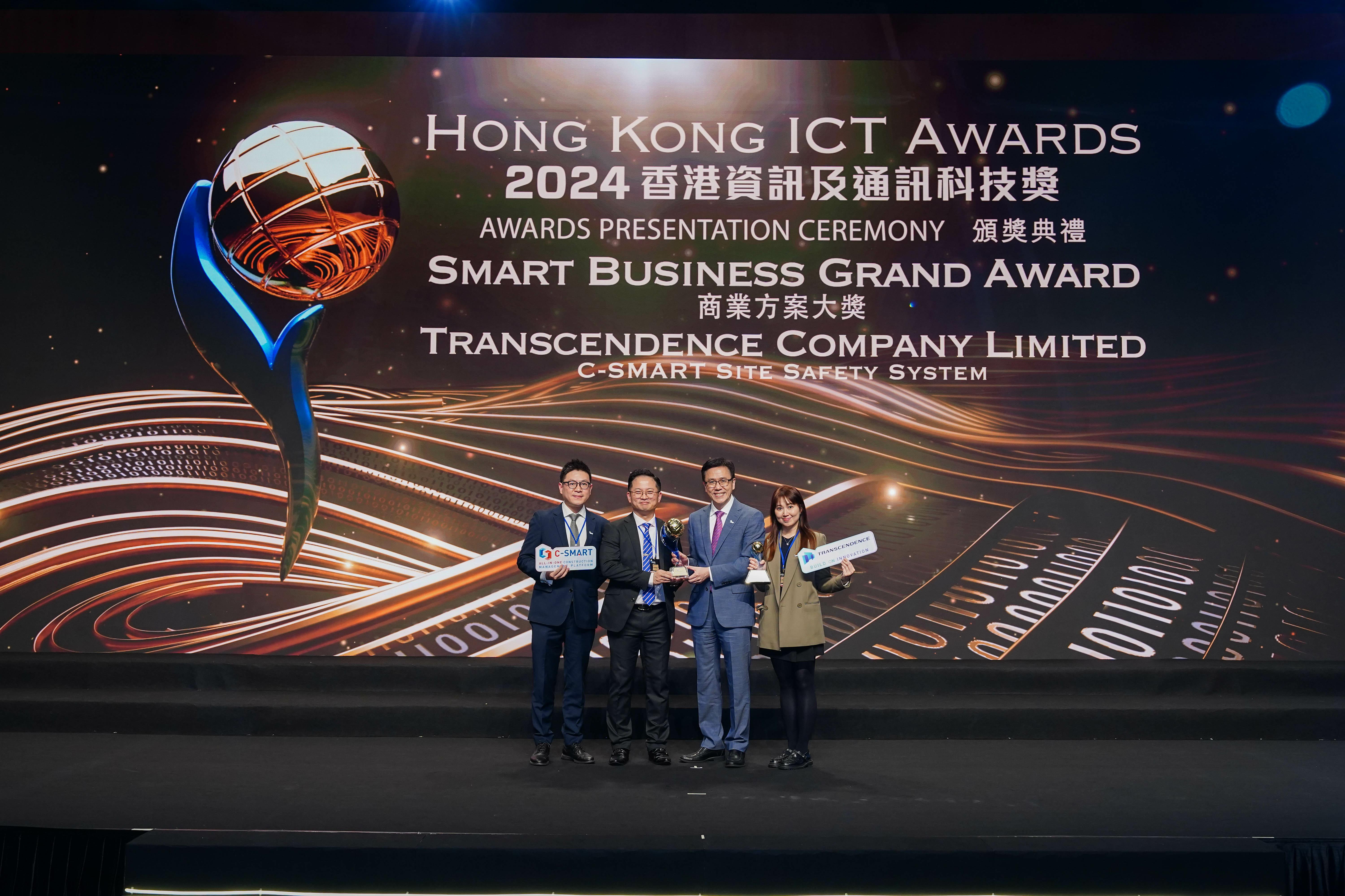 商業方案組別大獎為該組別最高獎項,由孫東先生親自頒發。評審委會員會對「C-SMART智慧工地安全系統」給予高度評價,讚譽「該項目可為建築工地設立新的安全標準,對建築行業具有重要意義並產生廣泛影響,可惠及眾多經營者和工人」。系統利用人工智能(AI)、物聯網 (IoT)和雲端運算等先進技術,提供超過16種安全解決方案,有效應對工地意外風險。其主要功能包括人工智能安全監測、人員實時動態管理、潛在火災偵測、智能手錶及智能鎖等,配合各類傳感器和4G/5G連接,安全數據能即時上傳至中央管理平台,並在工地管理人員和安全主任之間共享。一旦出現潛在意外風險,相關人員能迅速有效地應對。