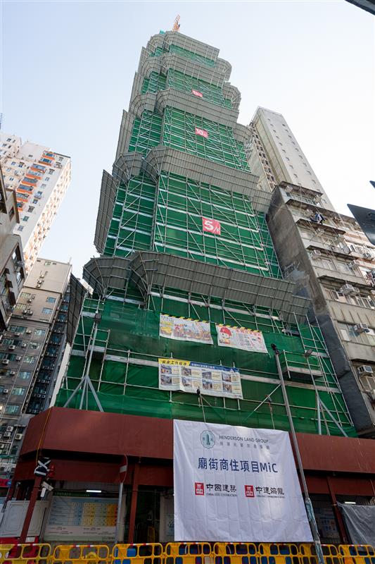 廟街項目坐落於九龍鬧市,緊鄰知名的廟街文化地標,周邊夜市、食肆與小販攤檔林立,商業活動頻繁。項目採用全組裝合成技術,大幅減少建築廢料、揚塵及施工噪音,實現對周邊社區的低影響施工。