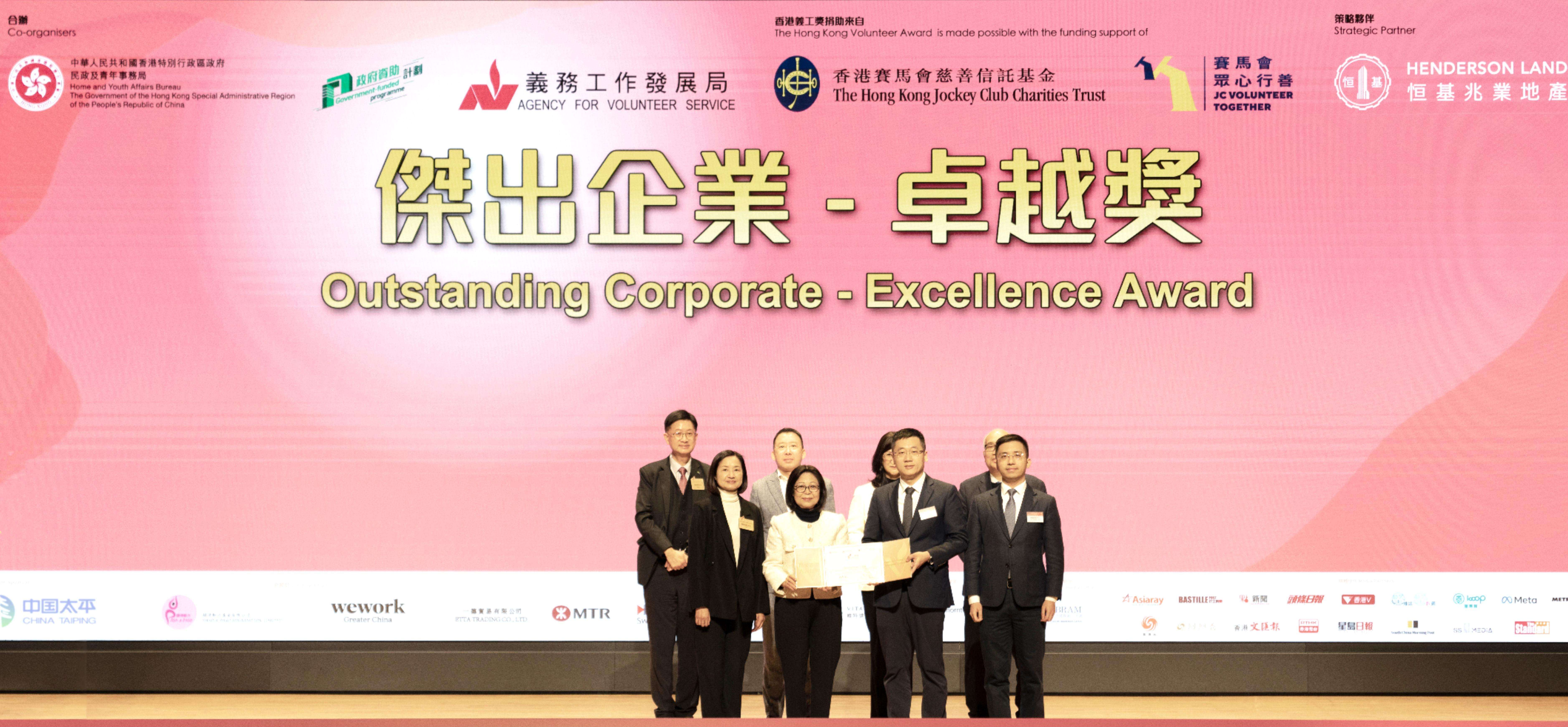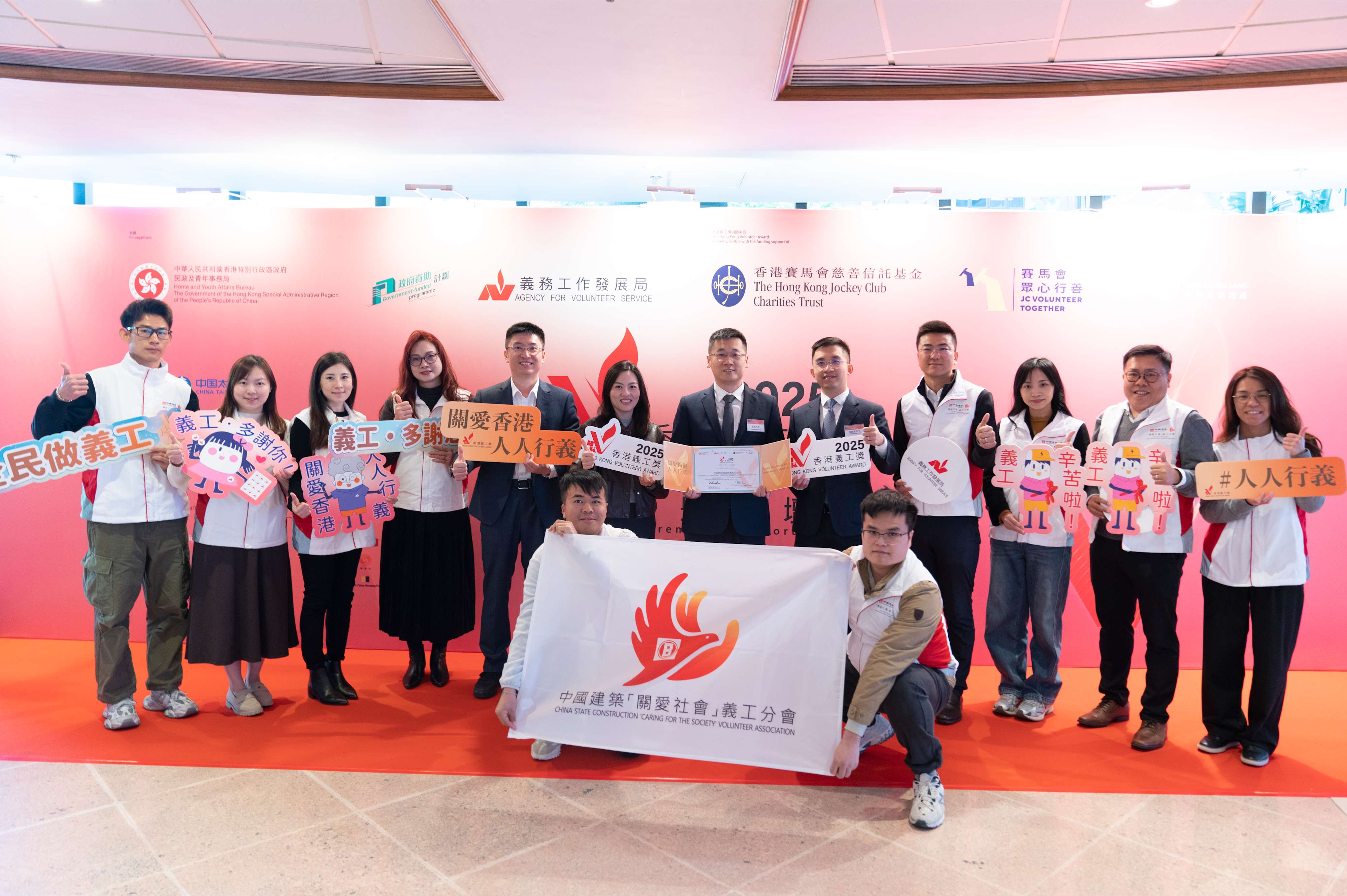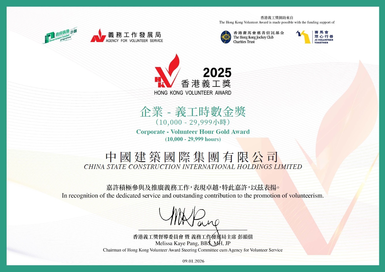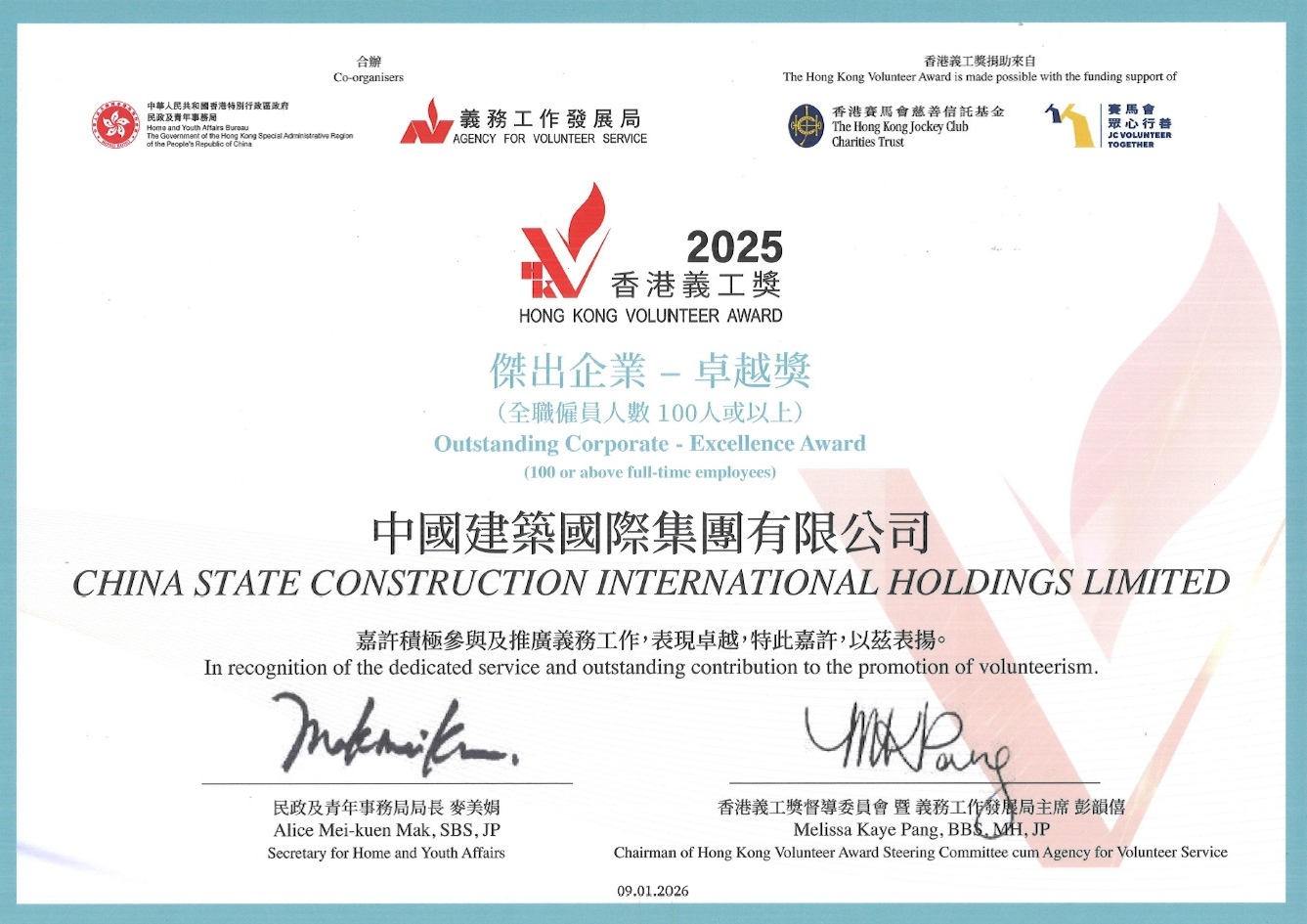 2026年1月9日,中國建築國際集團有限公司(以下簡稱「中國建築國際」或「公司」)榮獲由民政及青年事務局與義務工作發展局合辦「香港義工獎頒獎禮暨論壇2025」頒發的「傑出企業——卓越獎」及「企業義工時數金獎」。香港特別行政區行政長官夫人、義工總領袖及榮譽贊助人李林麗嬋,民政及青年事務局副局長梁宏正等主禮嘉賓出席,中國建築國際高級副總裁張杰、中建香港助理總經理陳啓蒙代表公司領獎。這是公司連續第二年問鼎「傑出企業——卓越獎」這一最高榮譽,這份殊榮不僅彰顯出香港特區政府和社會各界對公司義工服務質量、創新模式的高度認可,更是對公司深耕香港、服務香港、與香港共成長的深厚情誼與責任擔當的贊譽肯定。